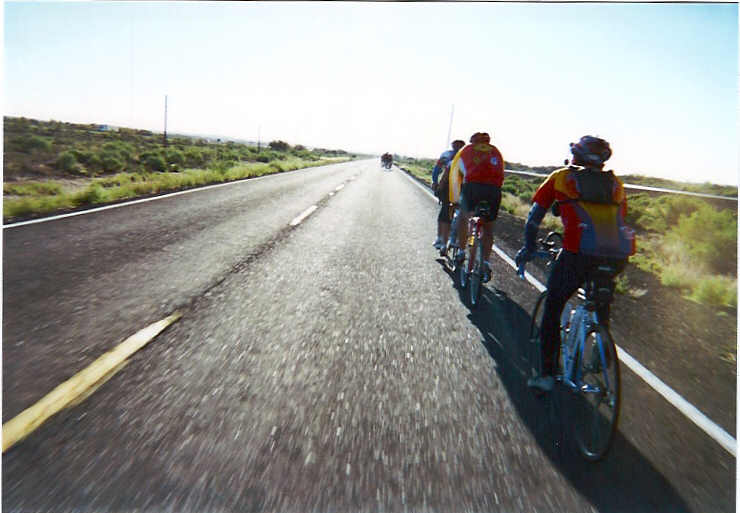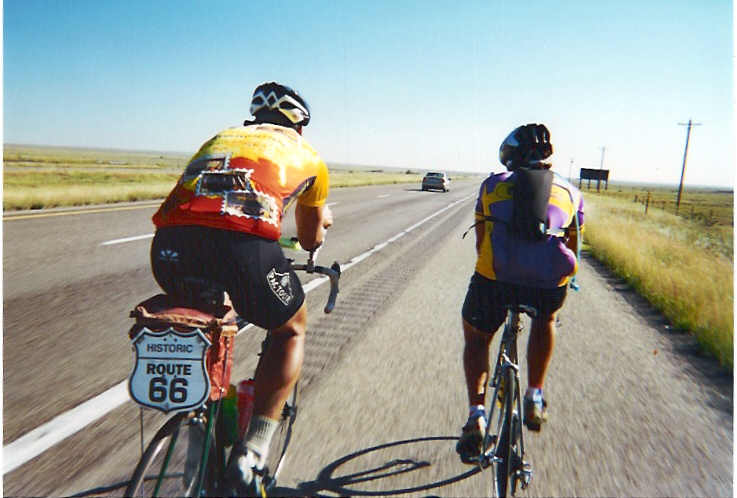 Landon and Richard from Iowa behind Josh and Doreen on the tandem, a few miles before we hit a strech of original Route 66 pavement that was so bumpy it made me drop from the pace line. |