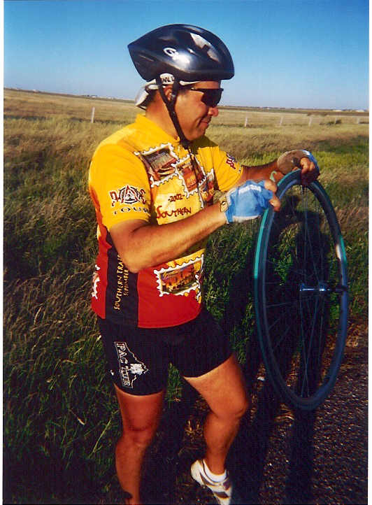 Bob from Davis, California, warding off evil spirits at some random point in the trip. Bob could really turn a phrase and made a bunch of us laugh throughout the trip. I can't imagine doing the ride without him and Larry. |