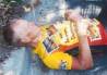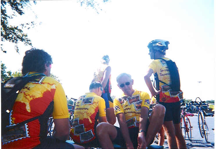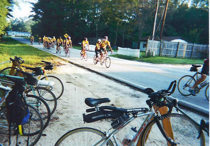 By early afternoon, however, my mood darkened a little. It started to get hot and humid, I had terrible cramps at one point, which wore me out, and some one made a mistake when marking the road and added eight extra miles to the day that I really didn't need. I guess it would have been anti-climactic, though, if the last day of the ride had been easy. Lunch was set up over a hill of fire ants again and, after we had been cussing and slapping at our legs for twenty minutes, Susan called out, "Watch out for the fire ants," apparently not realizing that most of us had noticed them by then. After lunch I rode slowly on my own until I reached the "holding area" before the hotel, and slowing down helped improve my mood.