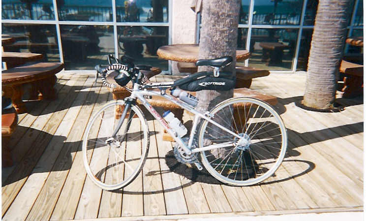 |  My bike at Folly Beach. You can see the reflection of the ocean in the window in the background and of me taking the photo. |