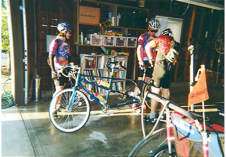 Sarah makes a surprise appearance in Craig's garage. That's Bikeaholics Lisaa, Craig, and Tom L. getting ready for a ride |