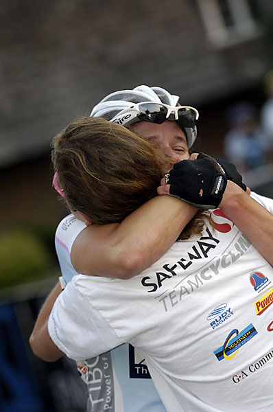 After the finish, I was mind boggled. I was so excited I almost cried. I was shaking. Linda came up to me and she was perhaps more excited than I was. I was jumping up and down and hugging her. It was an incredible moment. Then I saw the rest of the team! They had not been allowed to enter the circuit so they were there at the finish. I then found out that there were no time bonuses on the sprint points, so my "sprints" did not help me in the GC, but I landed the green sprinter's jersey. I felt sort of silly wearing it because the only sprint I actually sprinted for was the final one--but I was also thrilled!