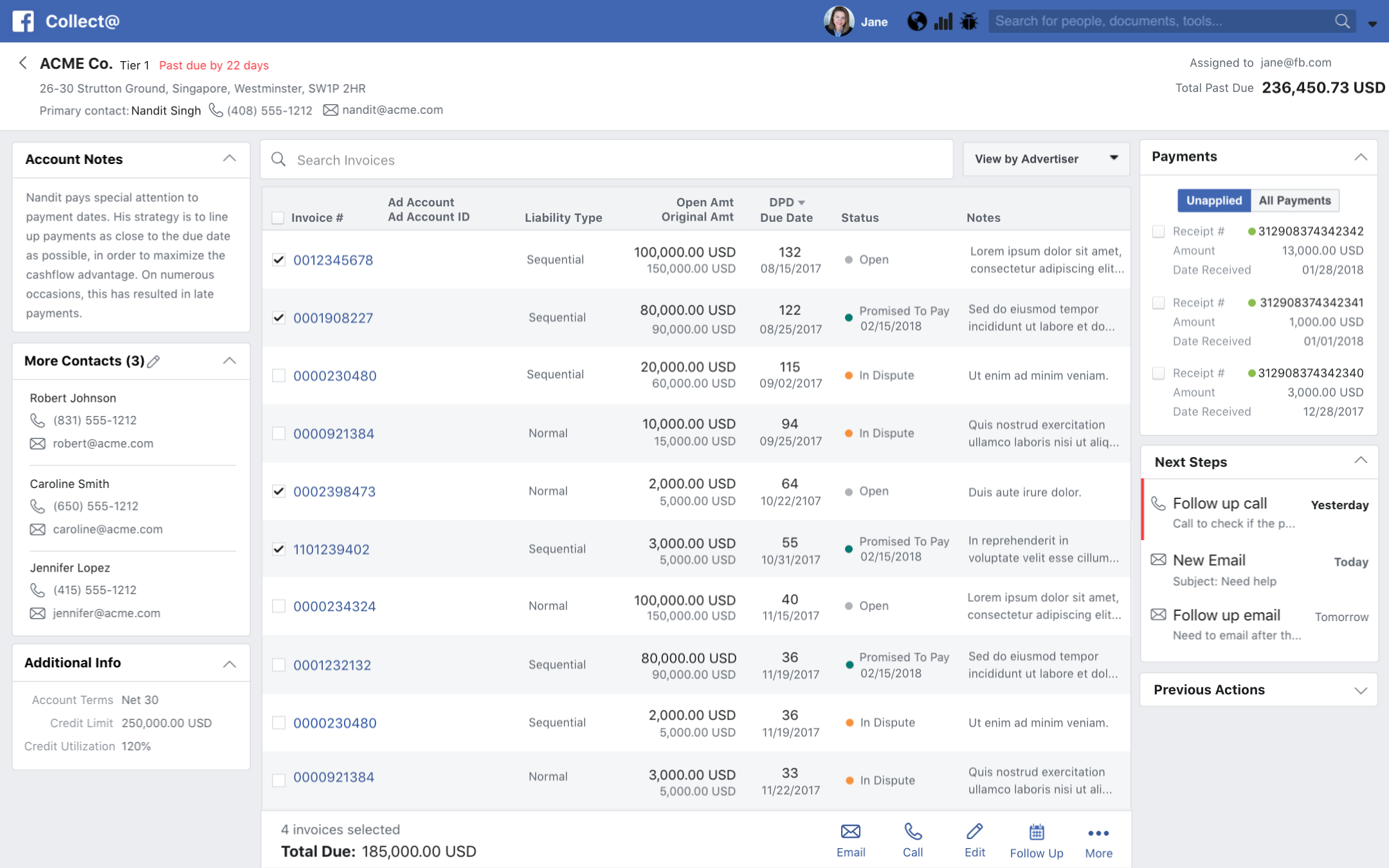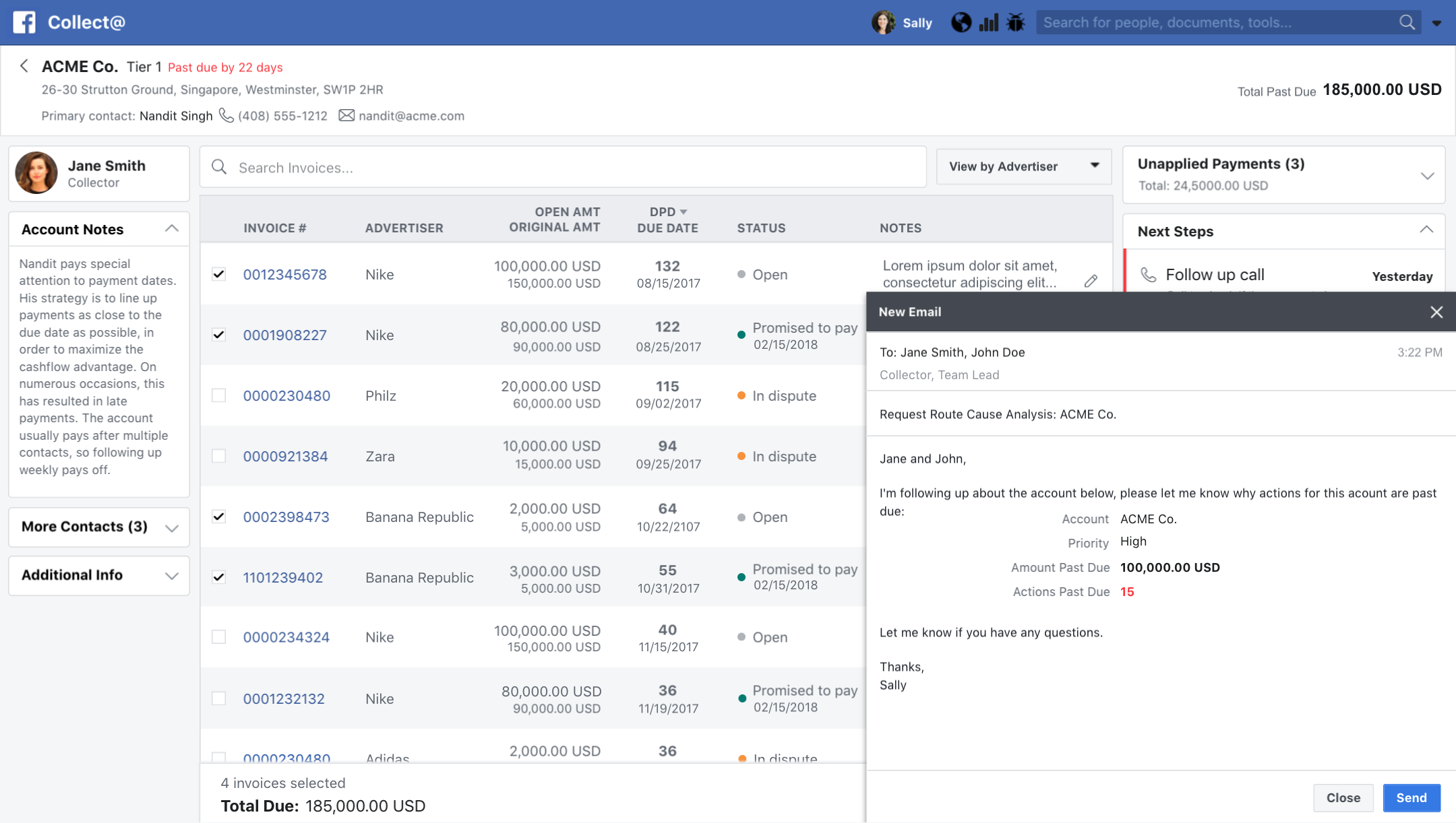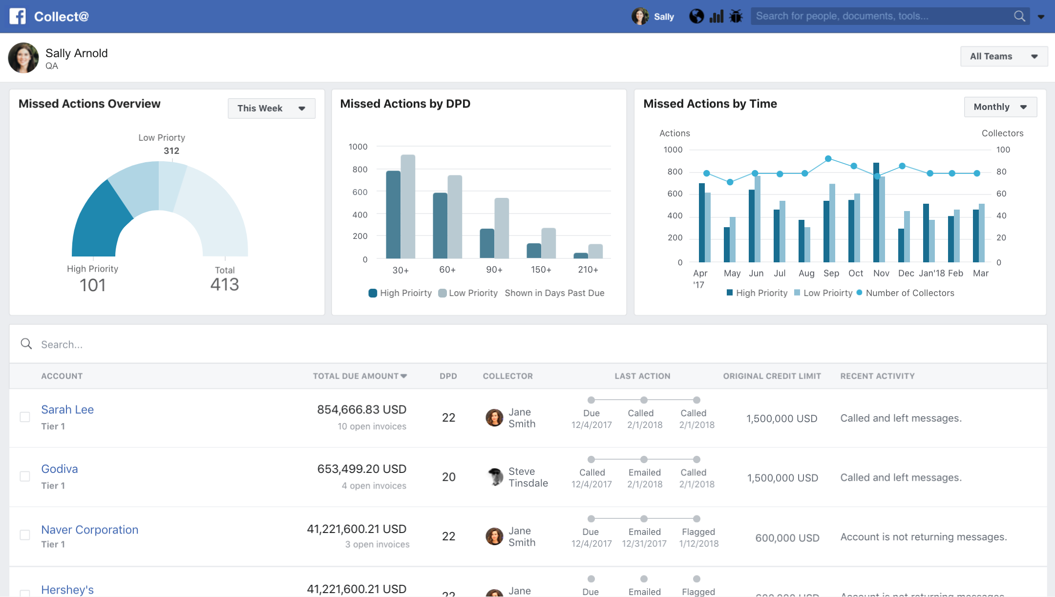 Within finance, collections agents need to work with advertisers to get them to pay invoices that are past due. Prior to the Collections App redesign, collectors were task oriented—they measured their productivity by how many advertiser contacts they made in a week. The purpose of the redesign was to get them be more goal oriented—to measure their productivity by the amount of payments they collected in a week.
